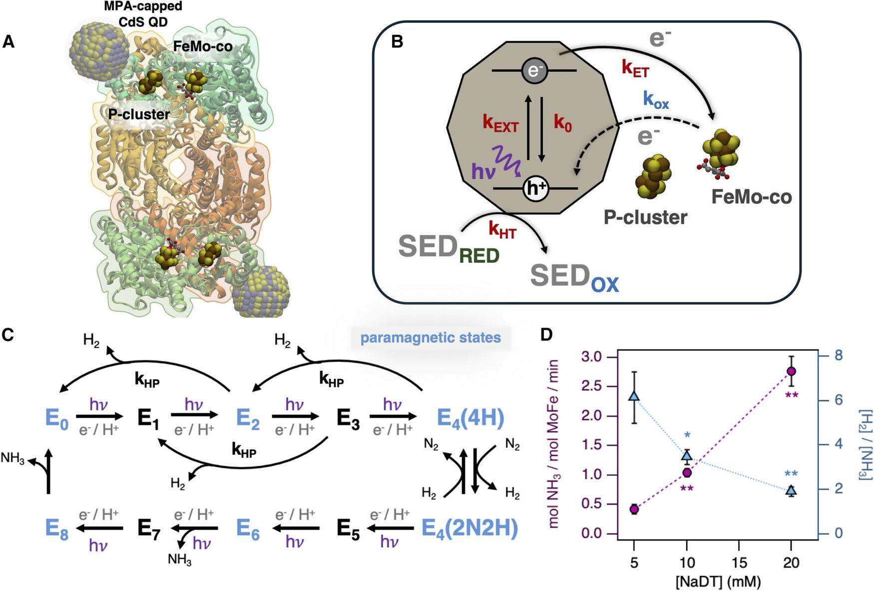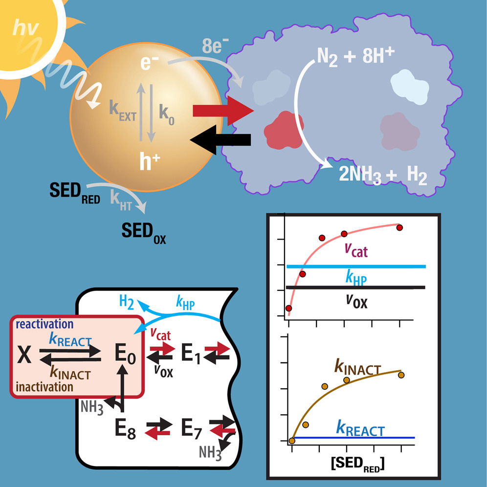 To address this, the researchers studied a biohybrid system that pairs the molybdenum-iron (MoFe) protein component of nitrogenase with cadmium sulfide (CdS) nanocrystals. In this setup, the nanocrystals absorb light and generate high-energy electrons, which are then transferred directly to the MoFe protein to drive the chemical reduction of nitrogen to ammonia.